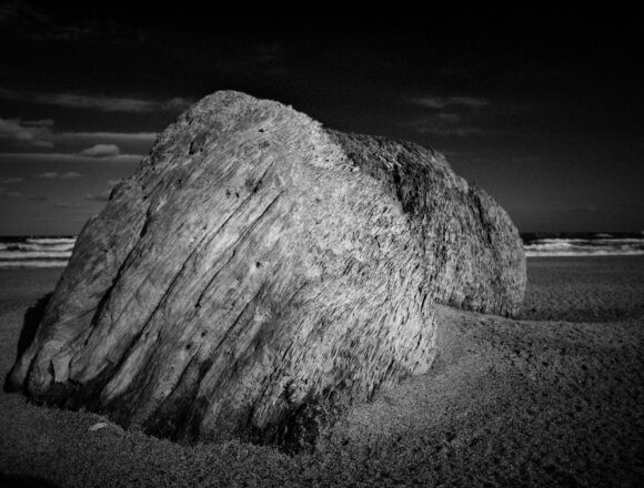 gr3x流木のオブジェ。誰かが砂浜に打ち上げられた流木を拾い、砂地にズボッと…