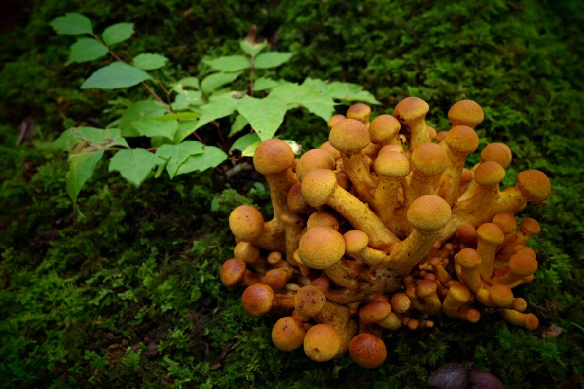 山中の明るい林の中、広葉樹の根元、雨上がり、手のひらを合わせた大きさ。街中のスーパー食品売り場でこんなのが袋詰めにされて売られていたような。