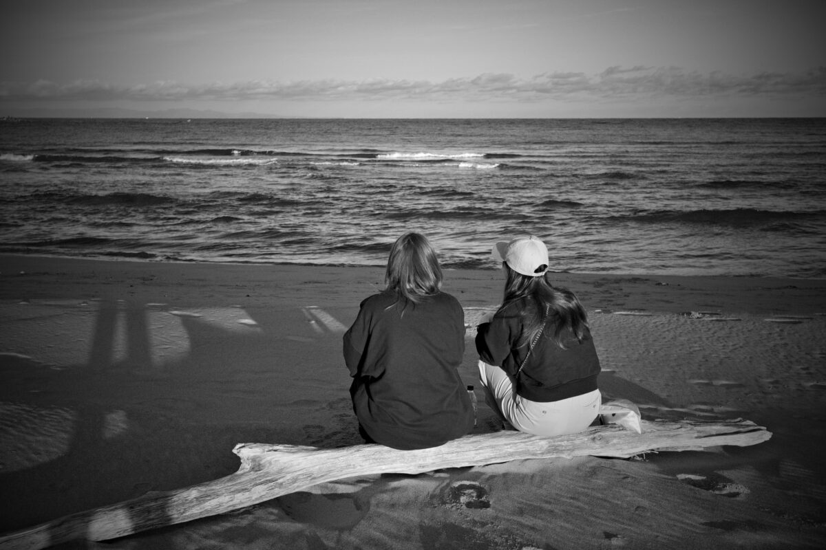右の女性は新潟の海が初めてと言う。左の友達が連れてきてくれた。撮影許可を求めた際に左の女性が「それ・・・」と肩に掛けたカメラを指さした。肩にはニコンのf3。