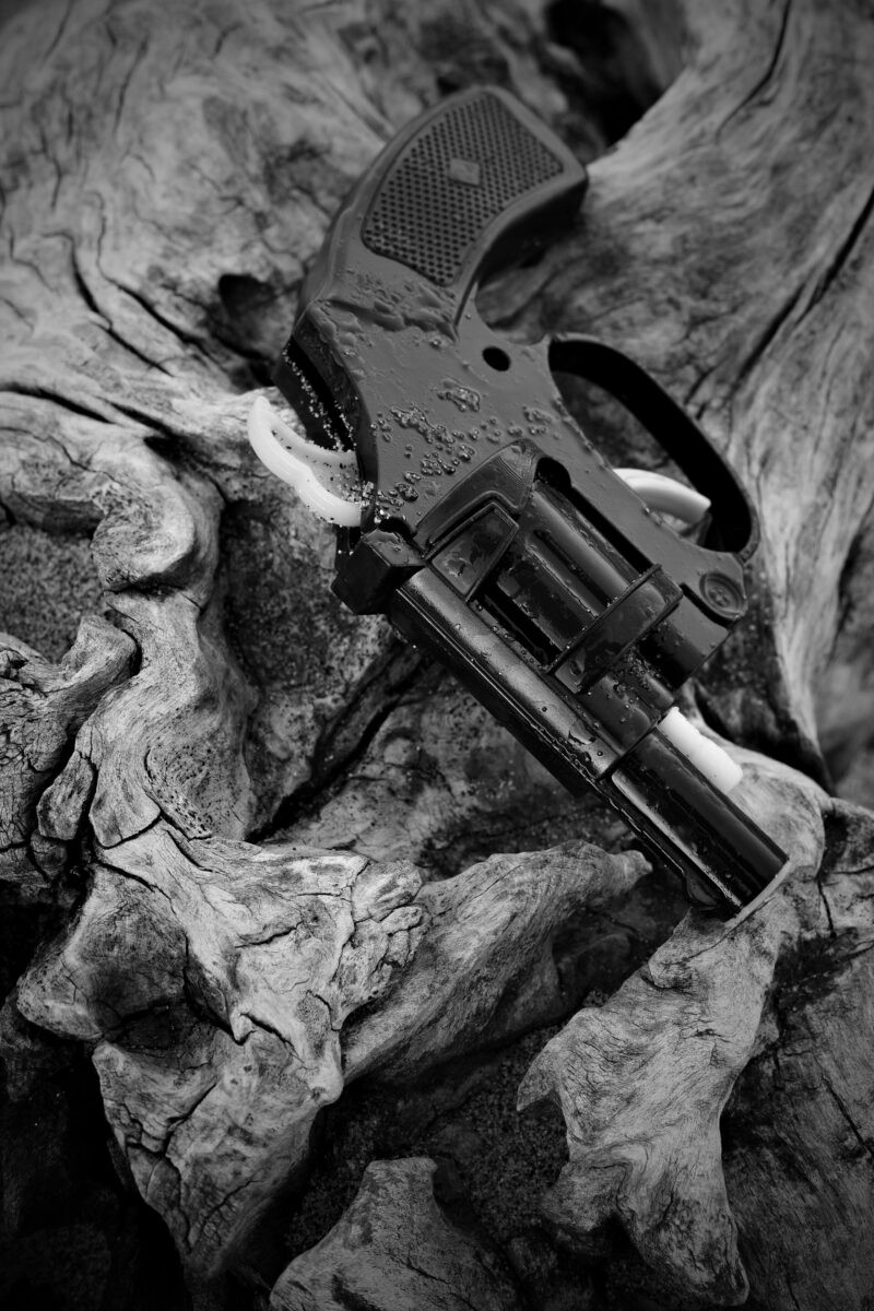 予想なんだけど、波乗りに興じているサーファーの誰かが浜に落ちていた拳銃を拾い上げ、仲間と戯れ、海に入る前にこの流木の上に載せた。それをワタシが見つけて撮影してる。