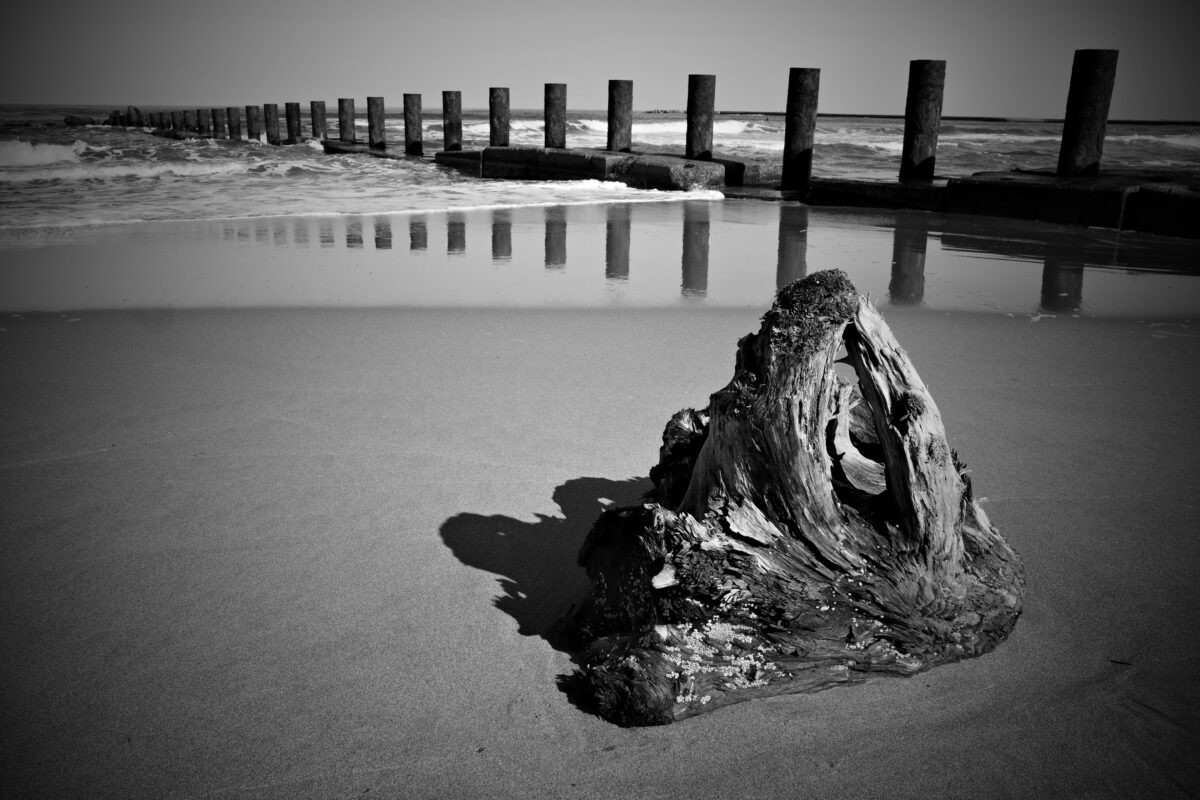 条件がハマったなと。潮が退いた砂浜が鏡になってさ。流木の形も良い。足跡もない。ボクの定番撮影スポットの割には、コレを見たのは初めて。最近、歩いても疲れないから今日はグングン歩いた。