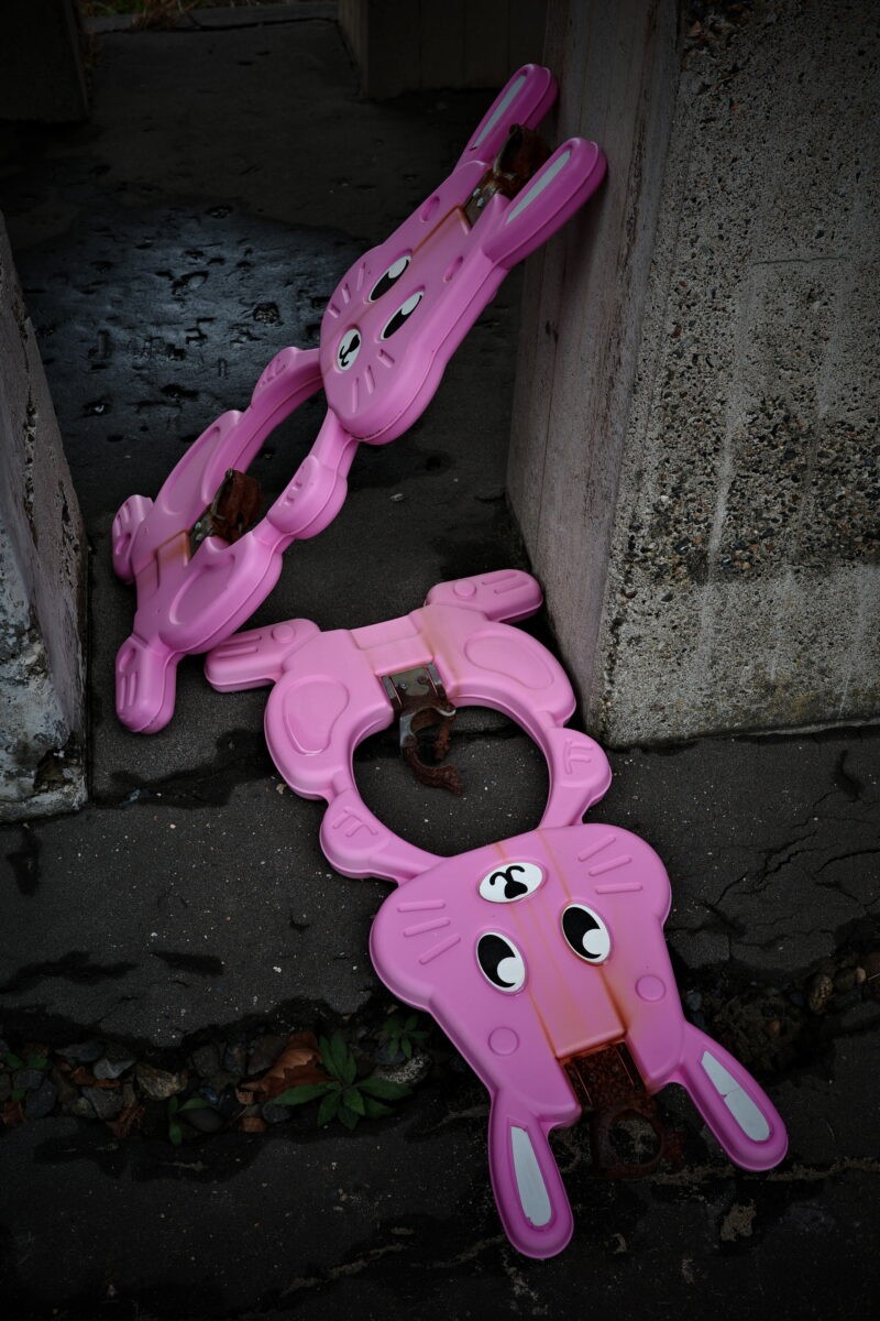 あっ、ピンクのウサギね。グレーのコンクリートの陰で一際目を引いた。