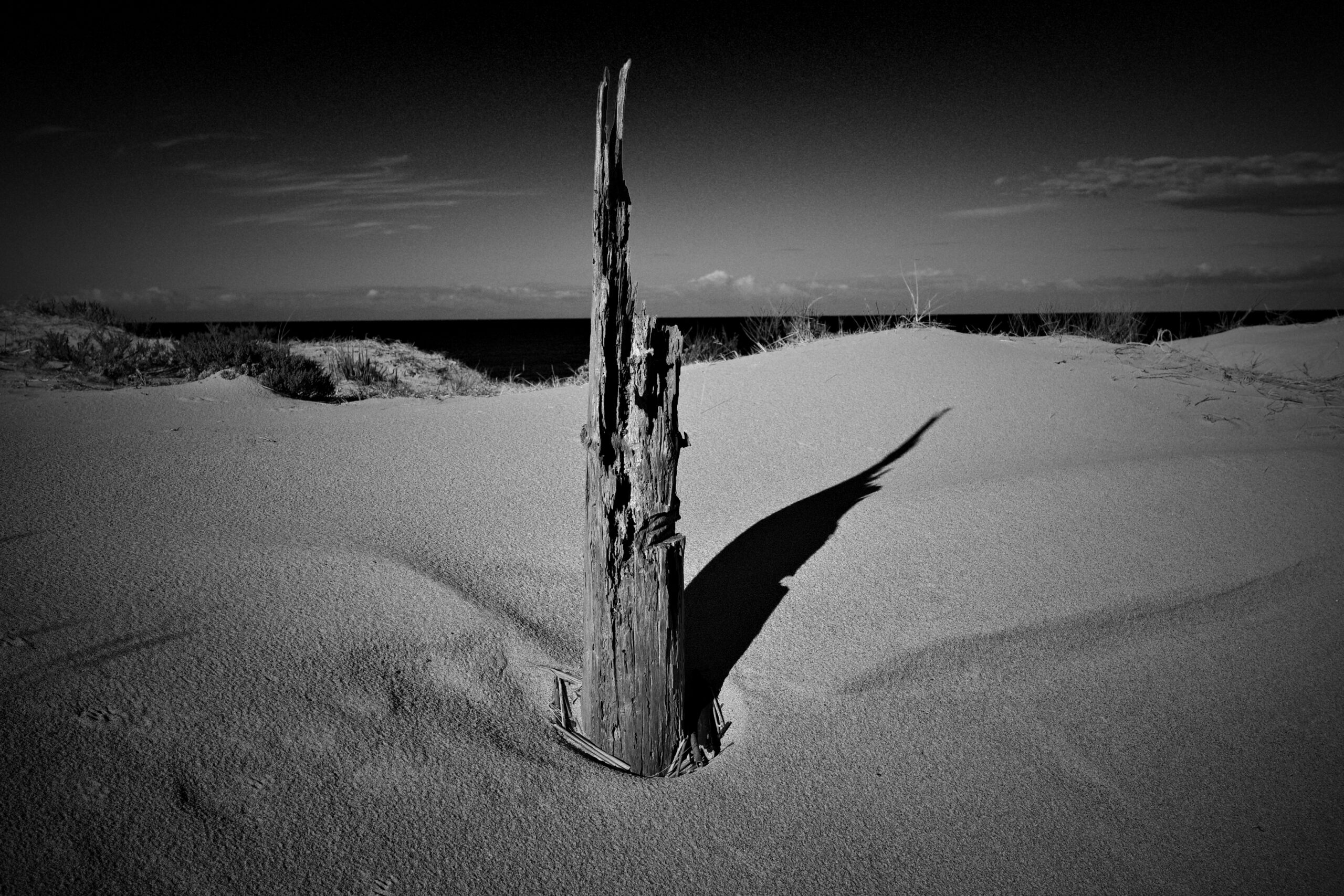 砂丘からの眺めは抜群なわけで、この日は遠く水平線上の雲を山脈と見紛う。そうかと思えば、ボクの立ち位置次第で柱が日時計になるのではと思ったりする。砂肌が絶妙に美しい。