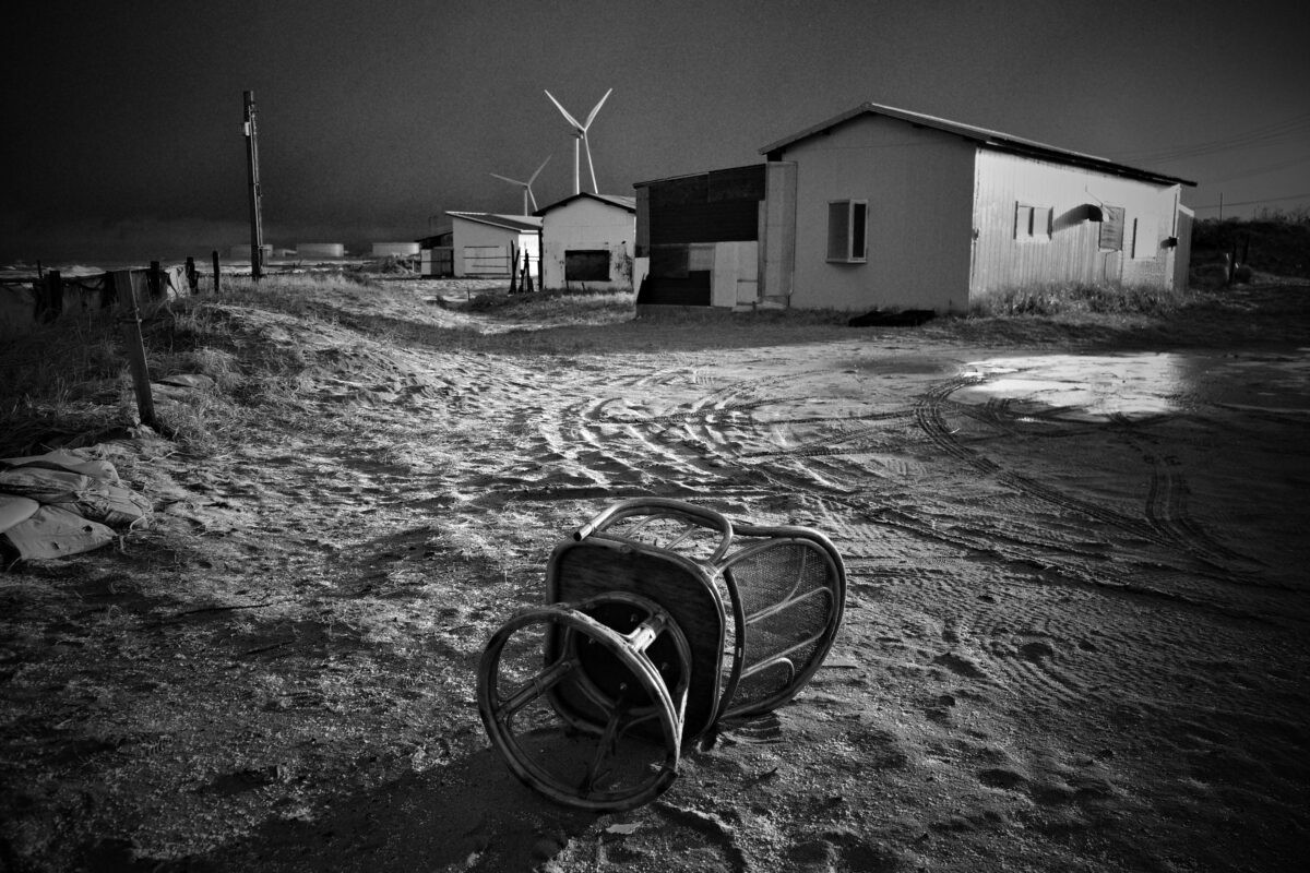 砂地に埋まった突堤残骸。シッポのように伸びた黒帯は波頭の跡。