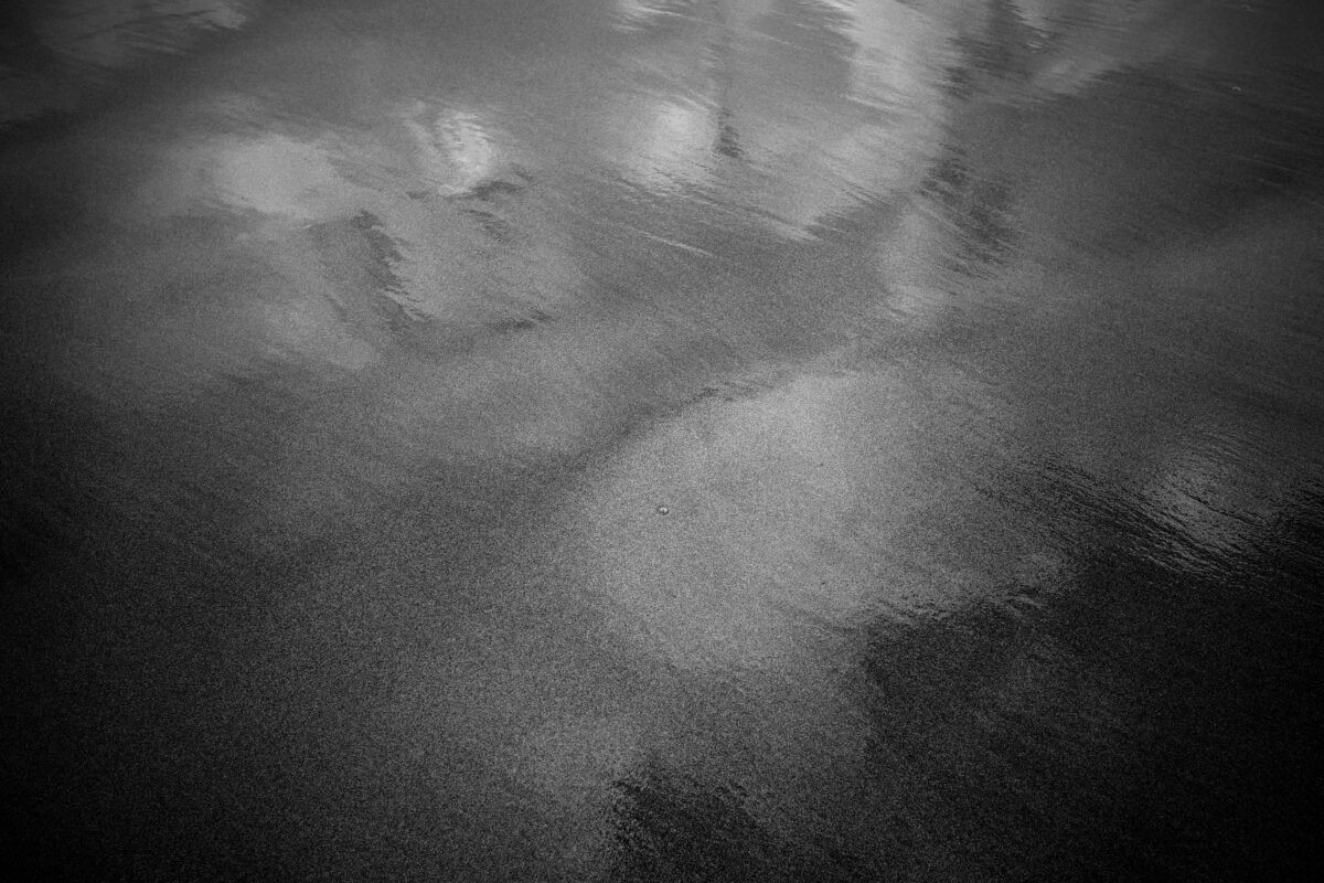 なだらかな砂浜へ波が駆け上がってくる。退くと砂地が濡れて鏡のように空を映す。40㎜の画角は中途半端だね。鏡になってる範囲だけフレーミングしようとするがコレが決まらない。