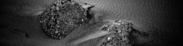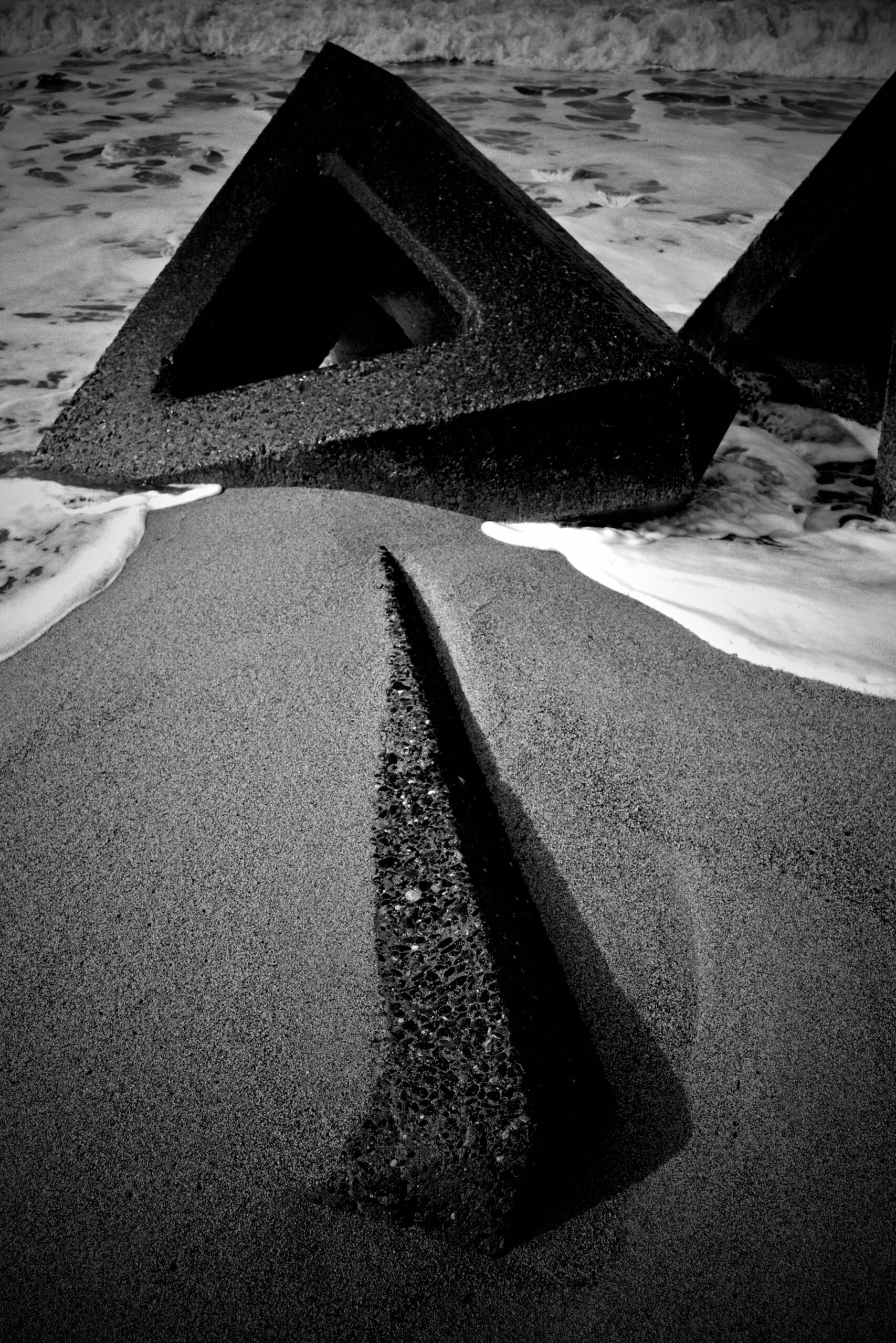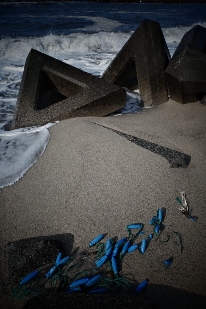 三角テトラを撮りに波打ち際までくると、砂地に鮮烈な青が目にとまる。