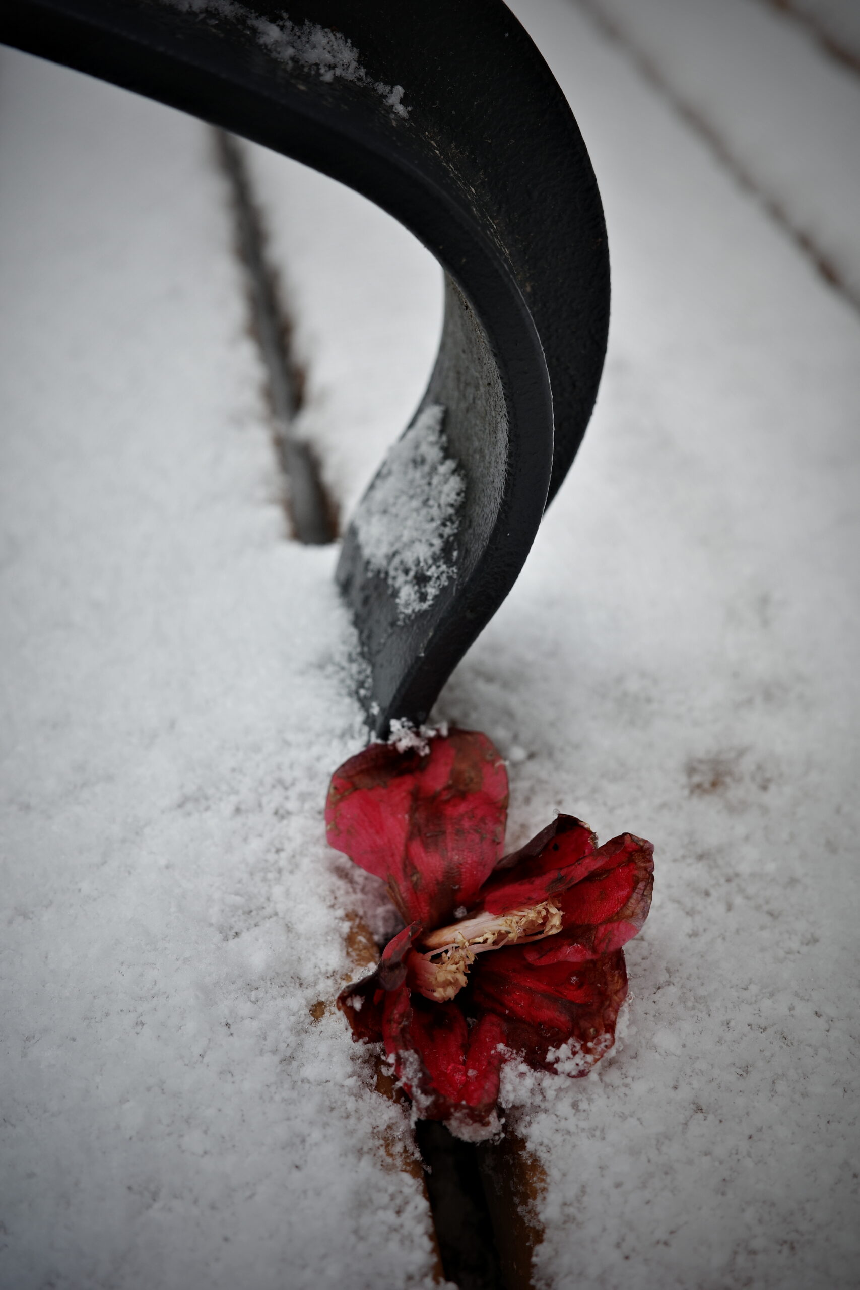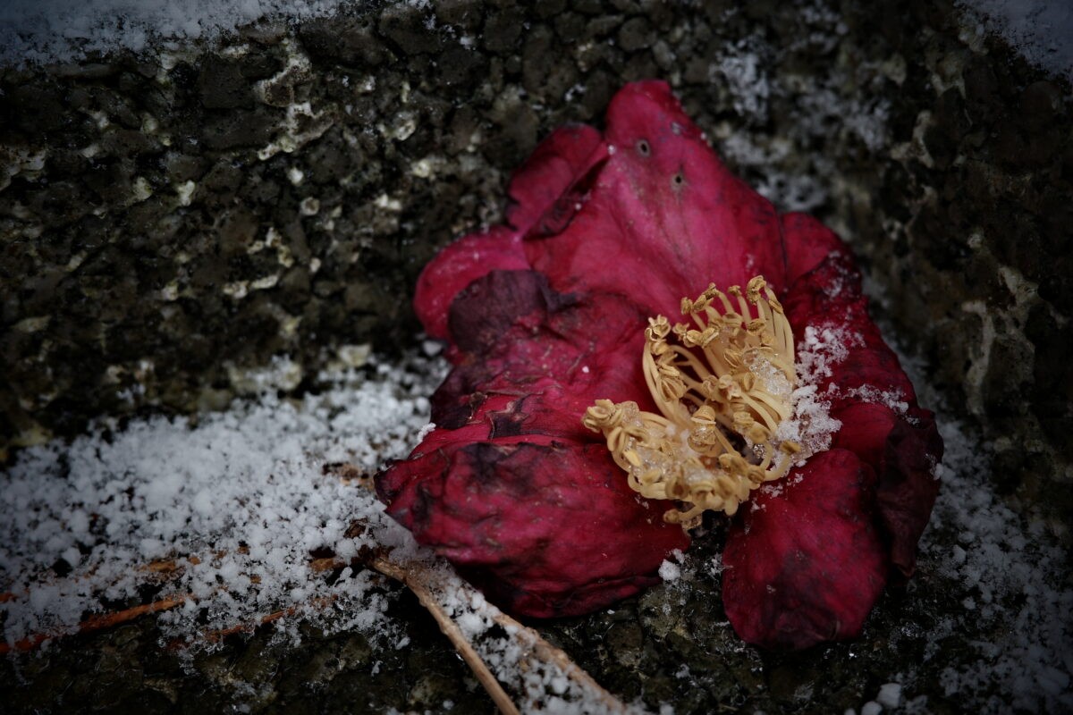 藪椿の落花を撮るなら、雪の降り始めに限る。朝の通勤時間帯を外し、昼近くなって公園へ行く。気温は最高で2℃までしか上がらない。事実、車のサイドミラーに付着した雪氷は剥がれない。
