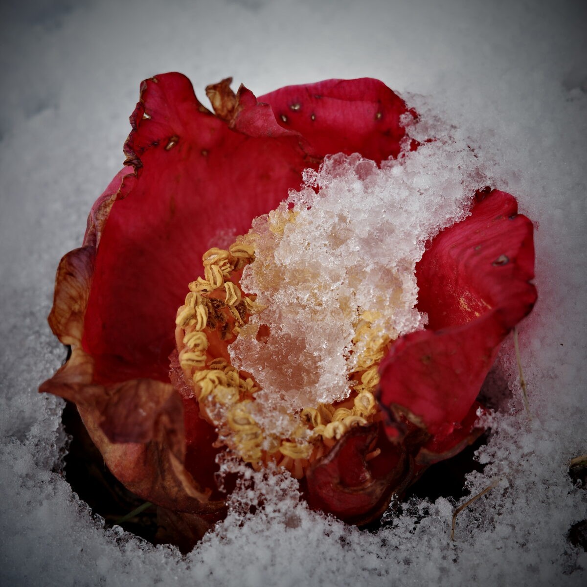 写真はそれこそ雪椿の落花。数個かたまって落ちていた中で、これはシベを上に向けていた。