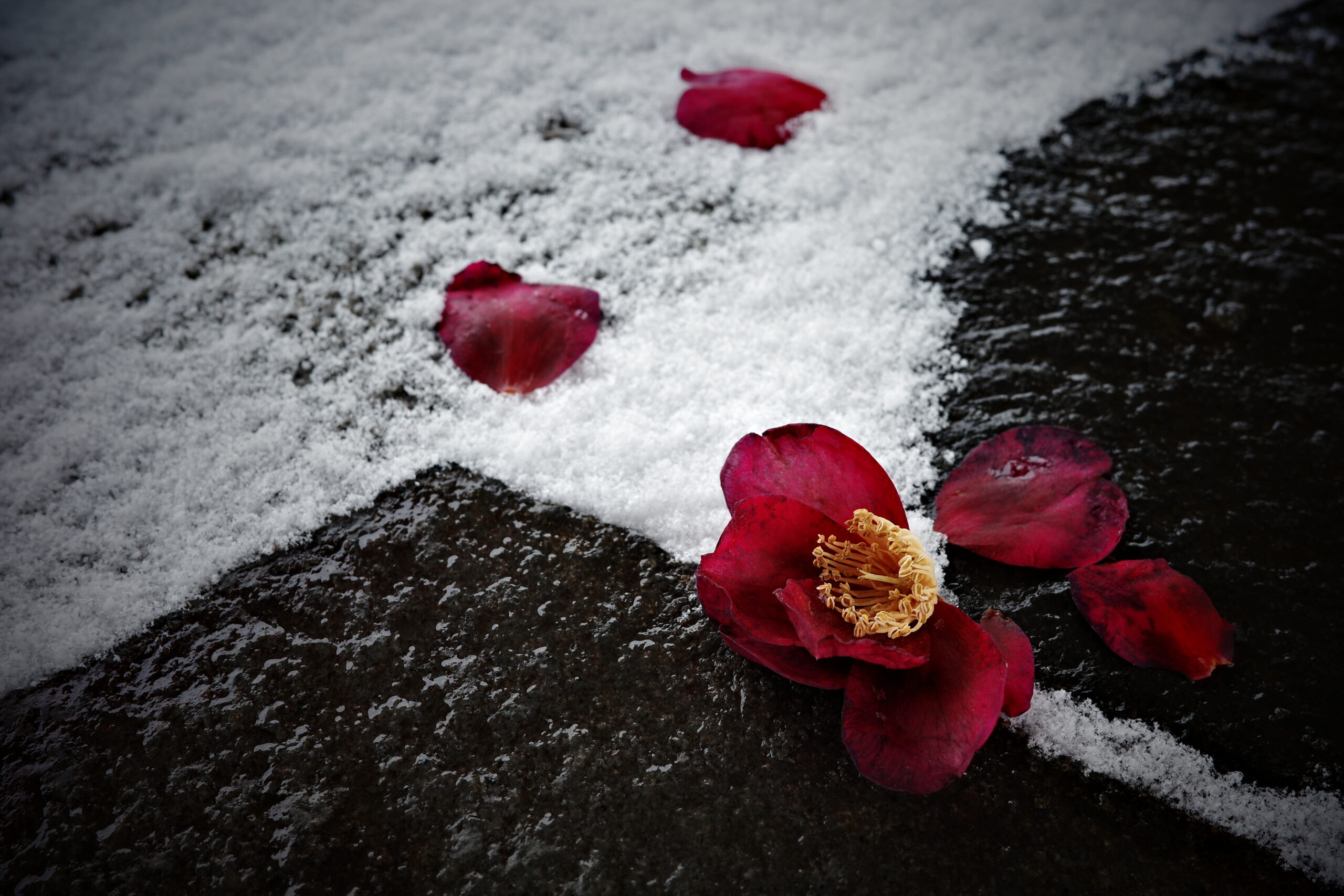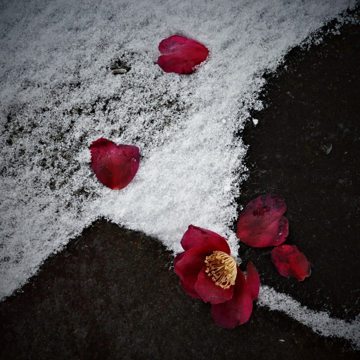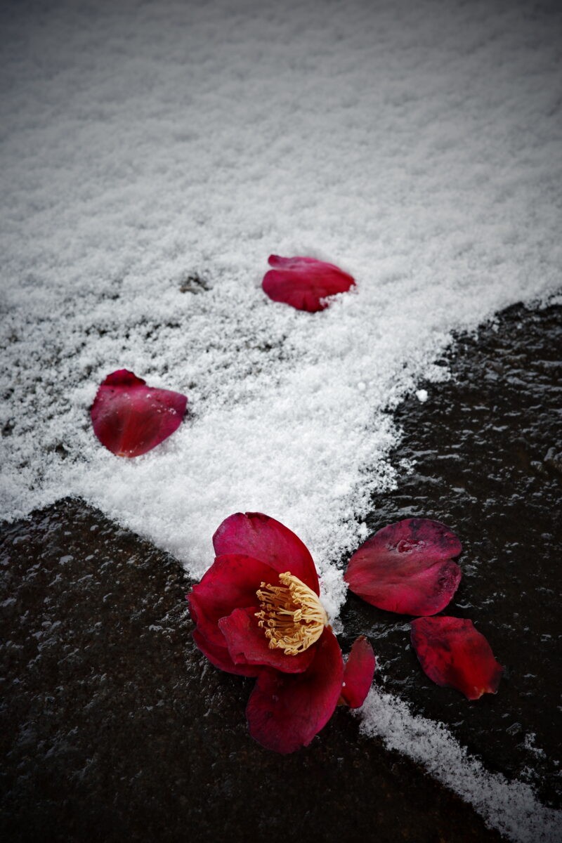 石畳の上に藪椿の落花が結構な数。吹き曝しの石畳にうっかり足跡をつけてしまい撮影できませんでしたとならないよう、ベンチに上がって周囲を見渡し、この藪椿に決めた。