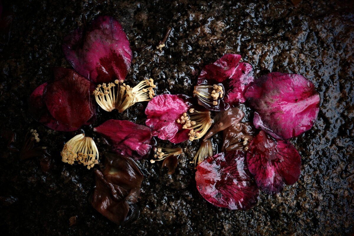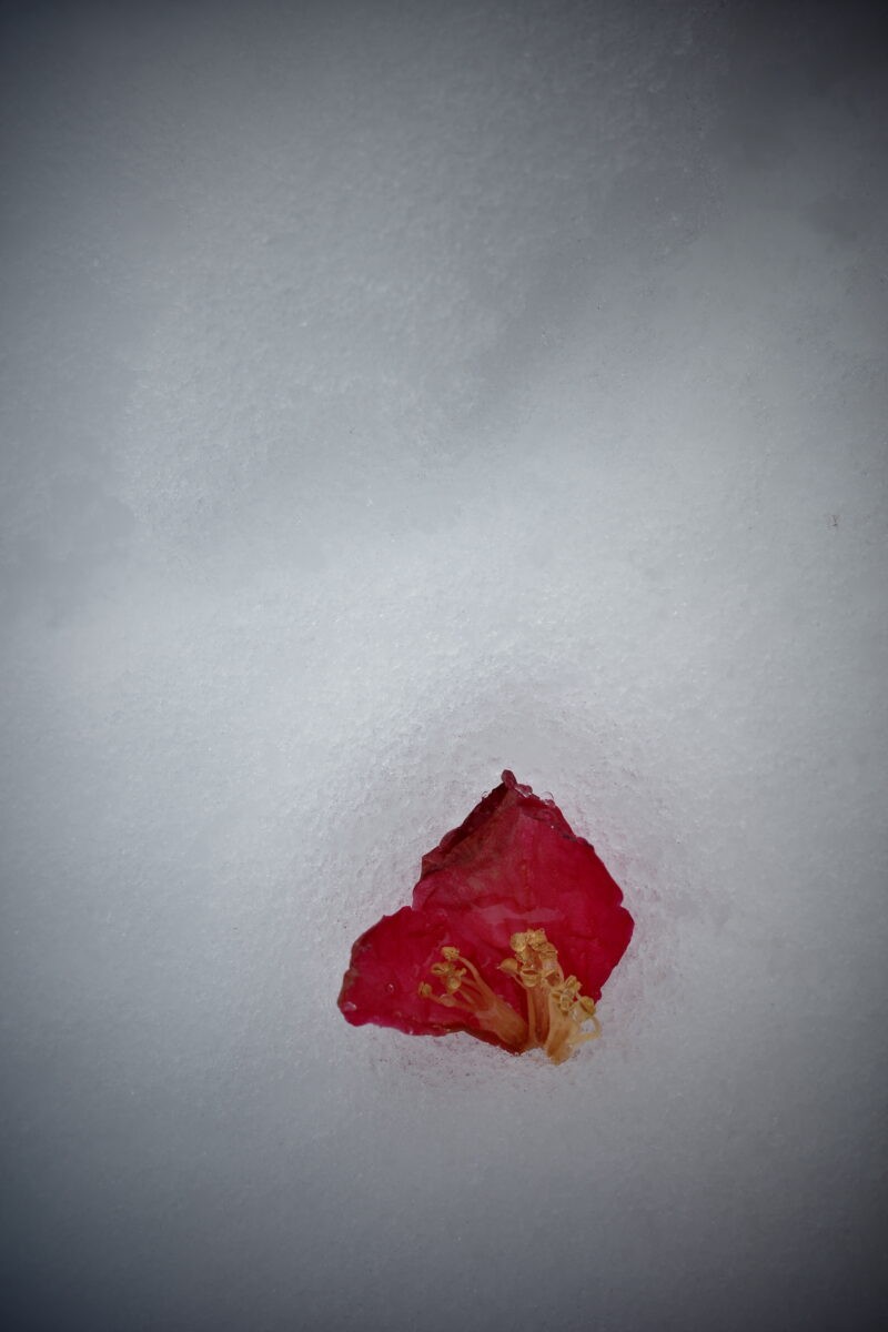 陽の当たらない灌木の足元に目をやると、光の乏しい中でシベの黄色が目立つ。かたや、真っ白なキャンバスに落ちた真っ赤な藪椿の花びらは近づくまでそうだと判らない。