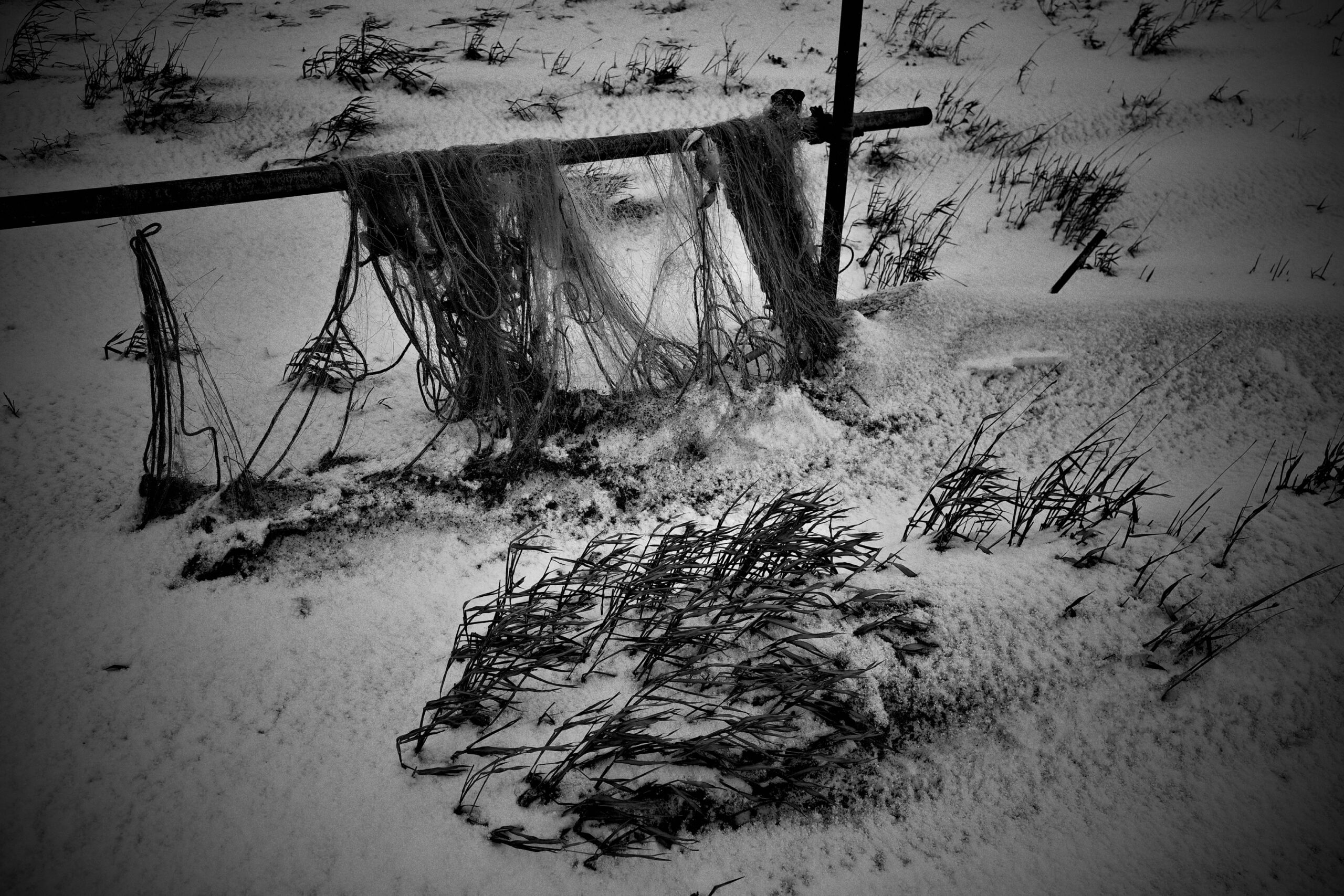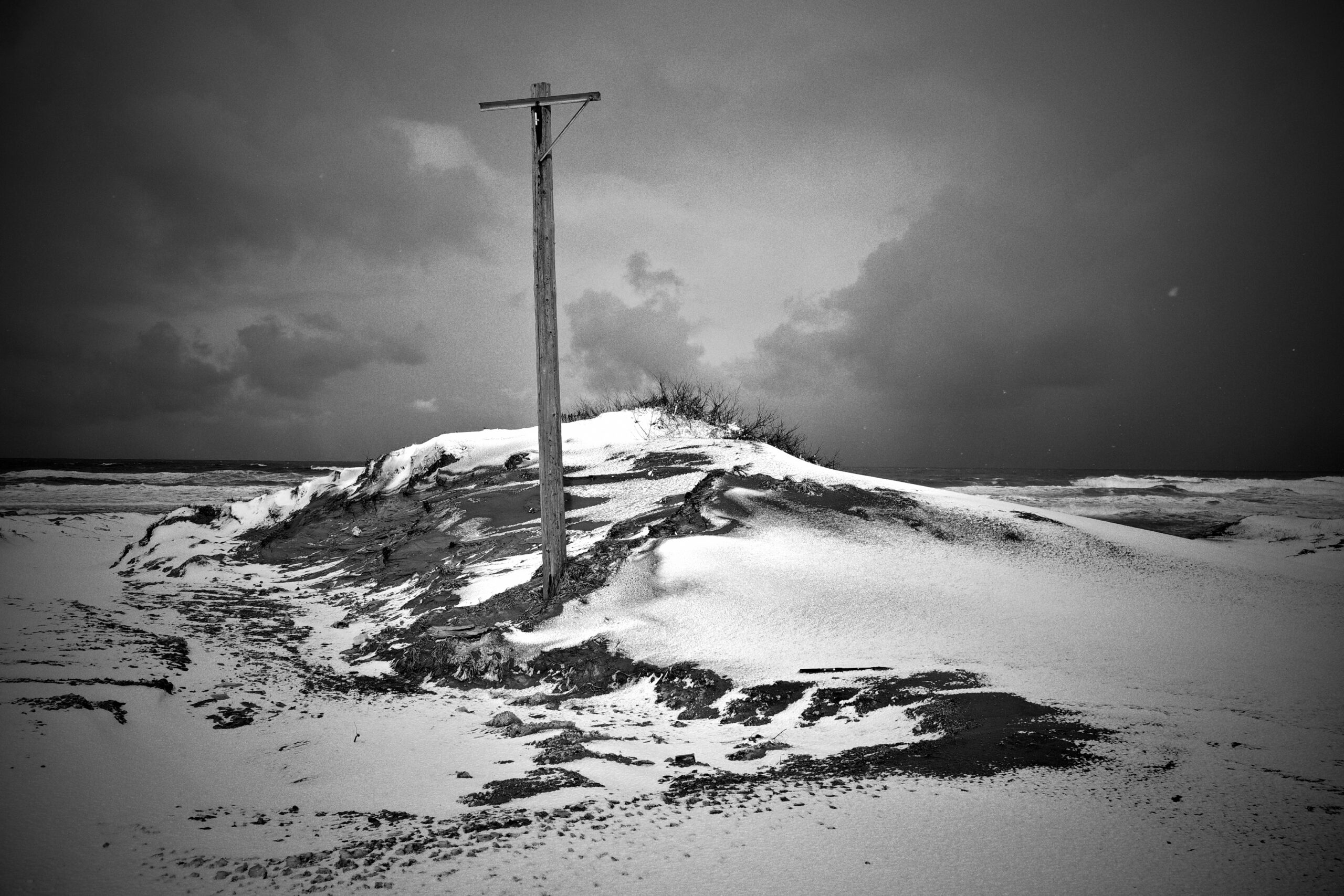 昨夜から今朝にかけての新雪が真っ白だった。砂の這った雪面はほとんどが海岸端。そこだけは黒炭の筋が幾重もなっている。頭に描いた夏の地形を思い出しながら歩く。