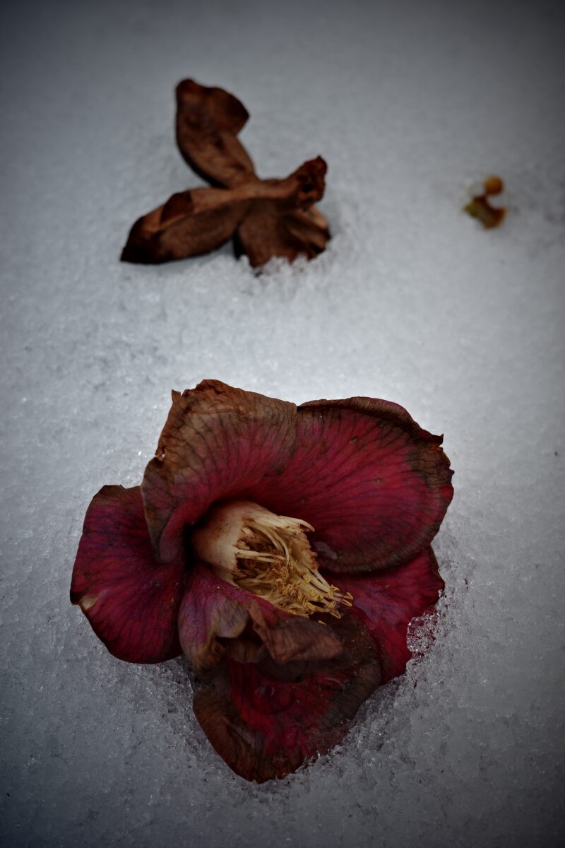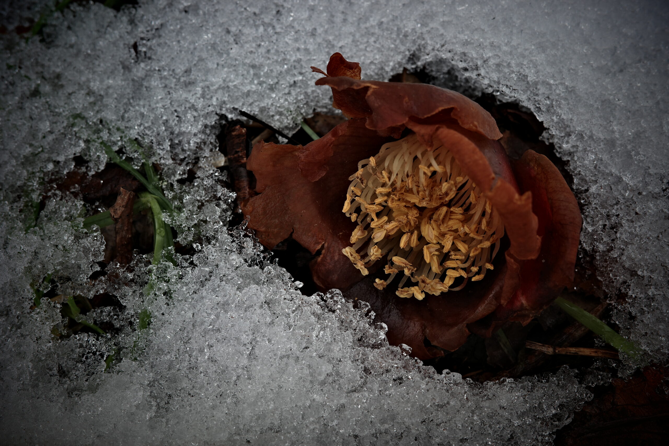 穏やかな一日だった。朝から陽が照った。風はない。気温が上がって、雪解けが加速した。2枚は午後3時頃に撮影してる。午前中、被写体探しで此処を訪ねた際に、落花は下半分が雪に埋まっていた。