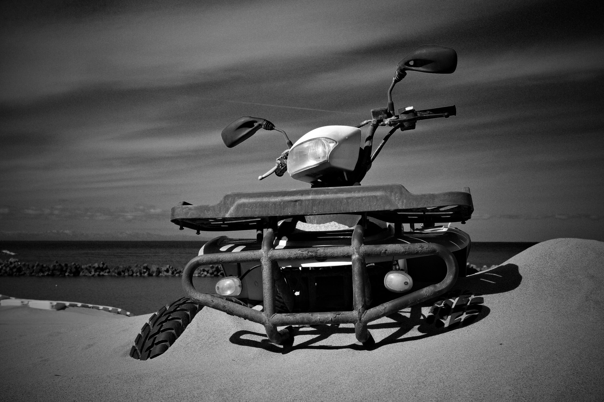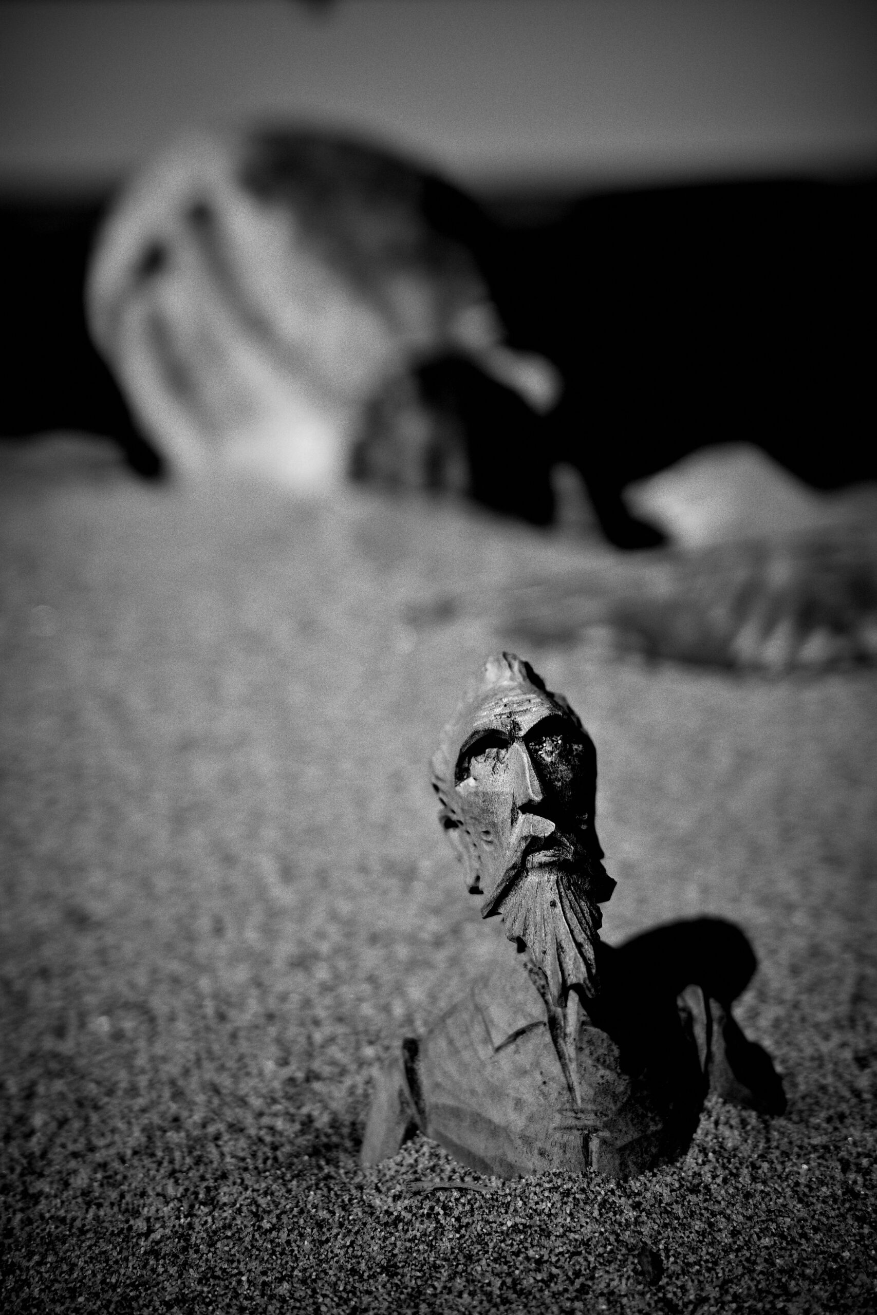 例の木彫り像を思い出す。さらに砂に埋もれていた。バギーも同様。春になり、浜茶屋がオープンする頃には、吹き溜まりの砂は綺麗に片付けられてるに違いない。