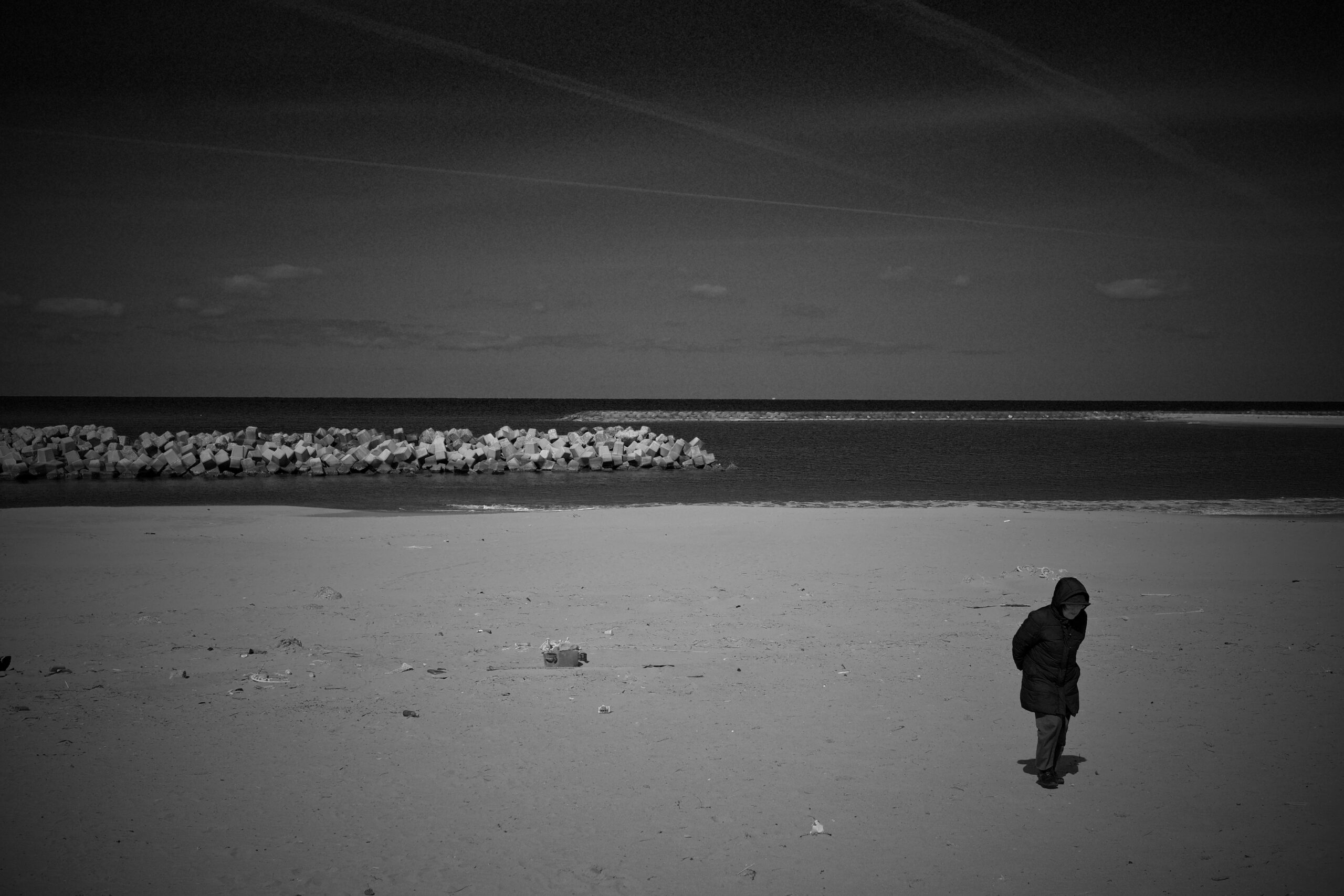 春陽が降り注ぐ新潟西海岸と言いたいが、昨日に続いてとんでもなく寒い。頭蓋骨が冷たくなる感覚。来ちゃったの間違いだったかな・・・と海岸出入り口で躊躇してたら、年増の婆さんが一人波打ち際に佇んでいた。もしや?・・・固唾を呑んで一挙一動を見守る。違ったようだ。背後にボクの存在を感じたかは定かでないが、おもむろに踵を返し、此方に向かって歩き出した。