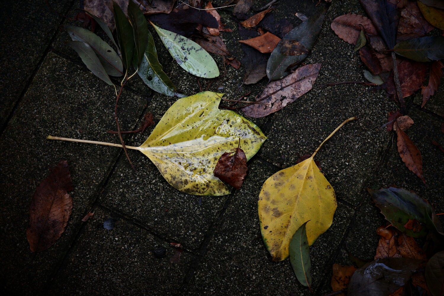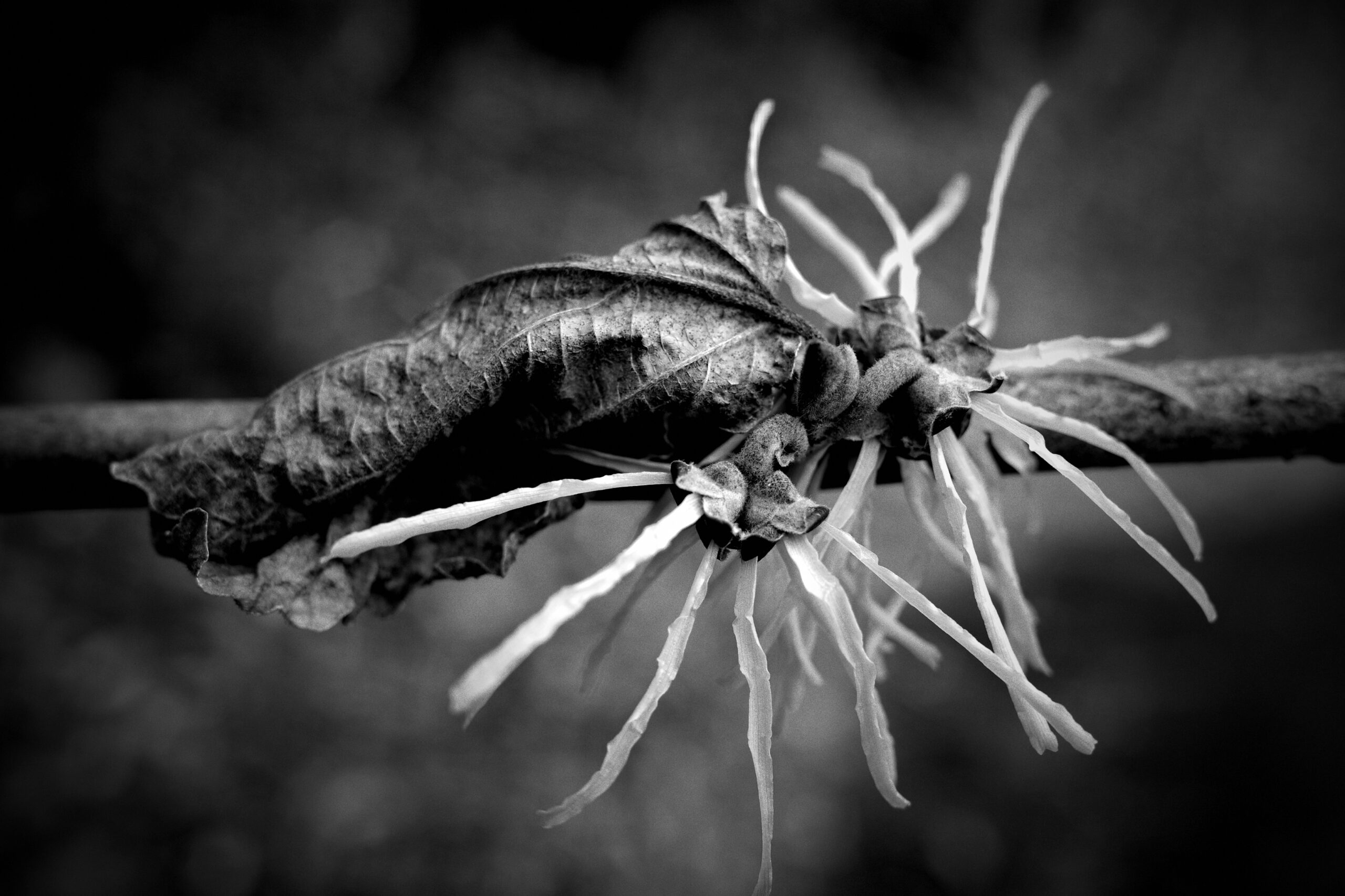 雪がチラつく寒い日だが、雲の流れによって陽が射したりする。車を停め、【犬コロの径】に入ると黄色いマンサクの花が目に飛び込んでくる。足元にはカクレミノの葉が一定間隔で落ちている。人間を連れた犬コロが数頭行き来している。4、5枚目はその中で撮影。