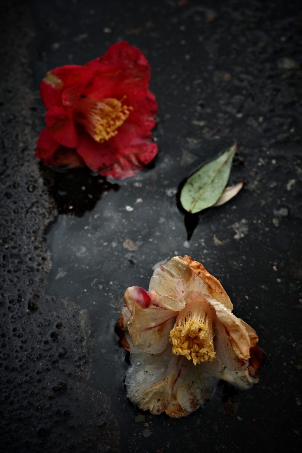 午前中の仕事から戻ると家の駐車場に椿の朽ち花が落ちていた。大家の敷地に植えられた椿で、落花は塀の上にもある。早朝に出掛ける際はなかったはず。急な雨と風で飛ばされたのだろう。