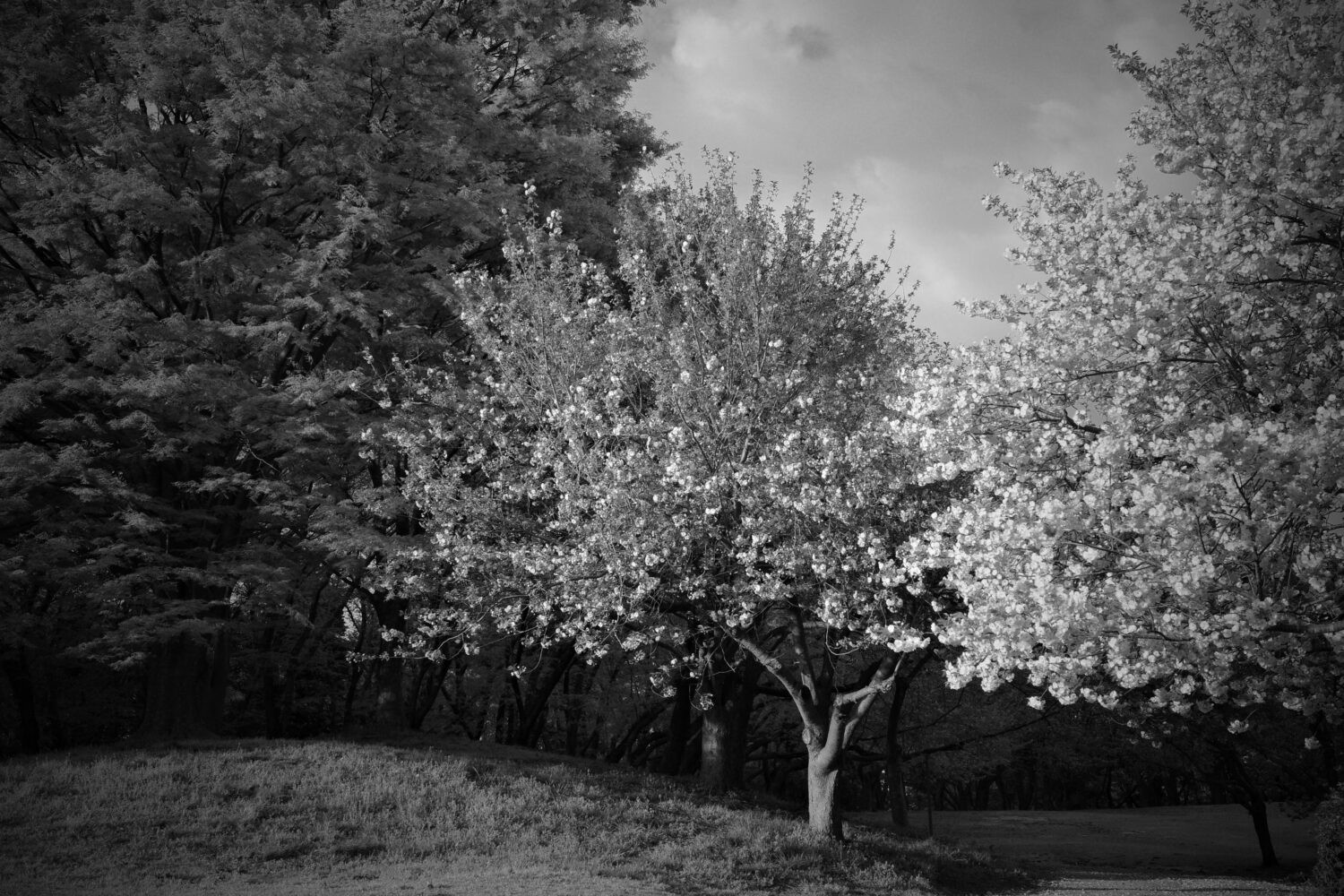 八重桜は8分咲きか。見ごろを迎えていた。時刻は5時半過ぎ。陽が雲を突き抜けて射してきた。何とも言えない美しい光。公園はボクだけの貸し切り。八重桜を新緑と絡めてポチる。